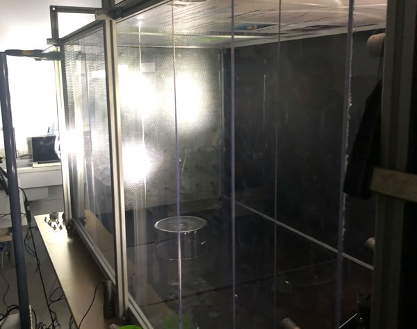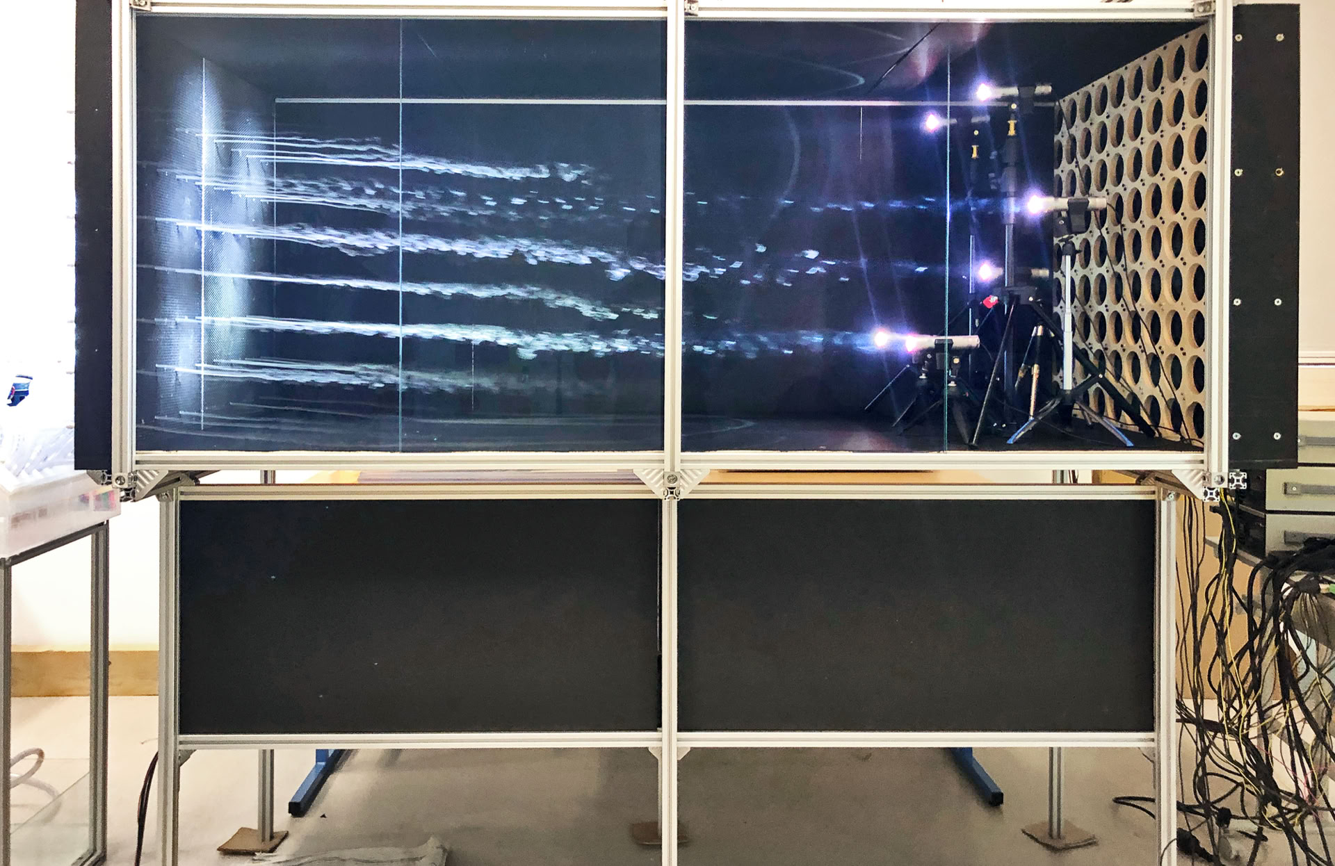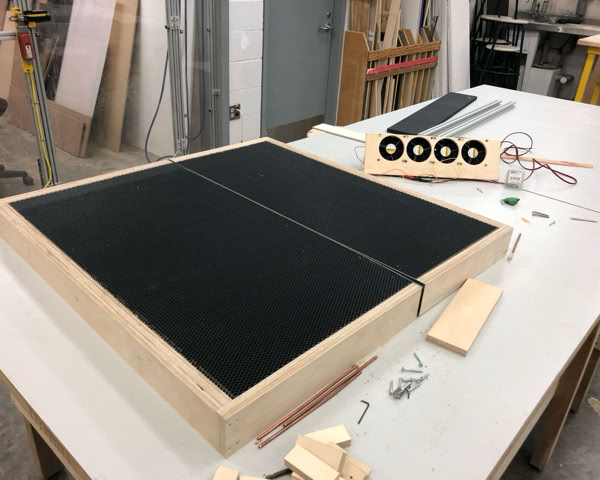 9 • View of the honeycomb panel air intake. The role of the honeycomb is to divide the air flow into a large number of laminar micro-streams, so as to allow the mist to maintain its configurations as long as possible. The light comes from the LED spotlights that are installed at the other ed of the enclosure.
