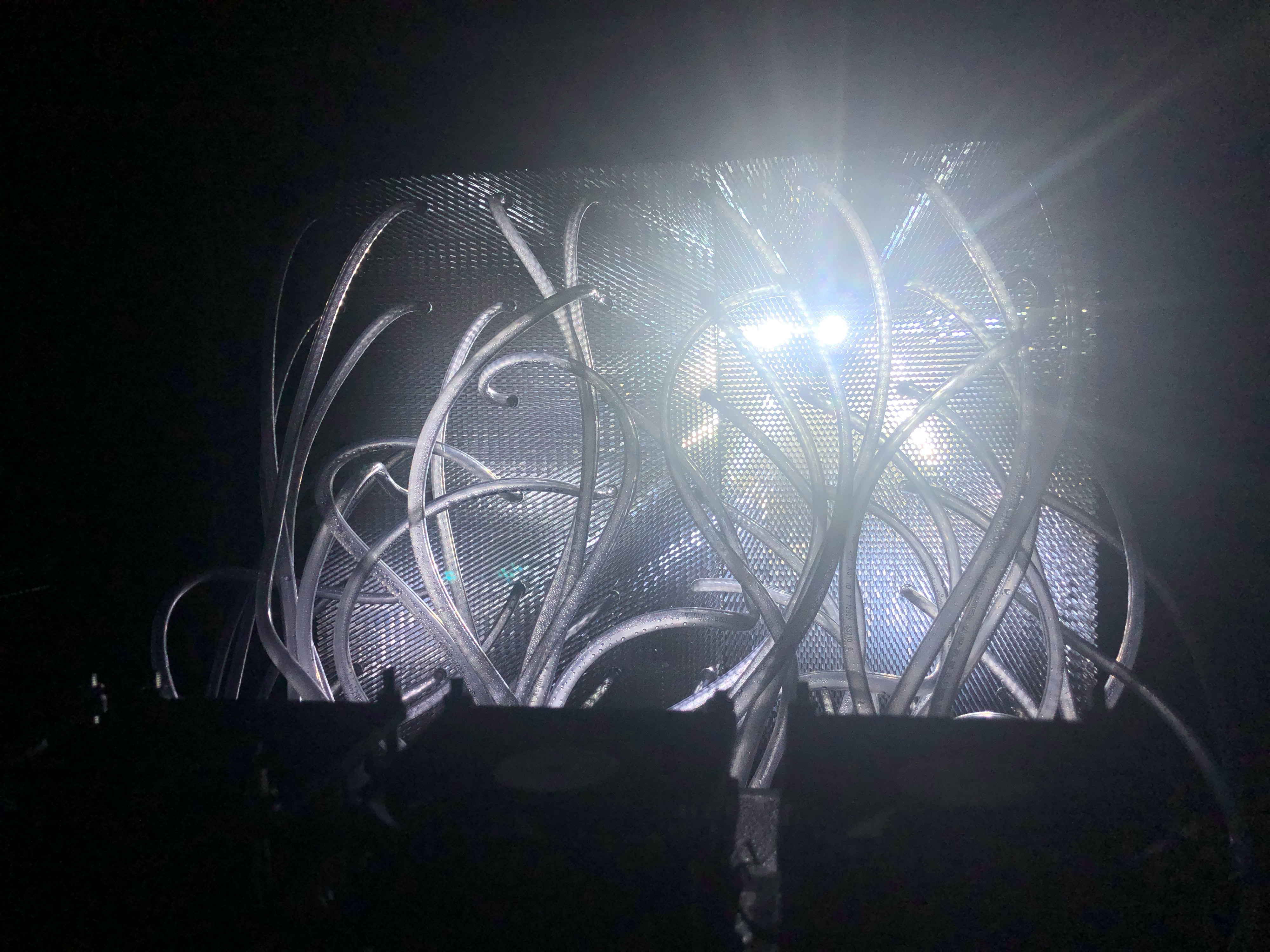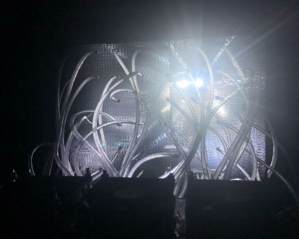 3 • The installation during its starting phase. The mist threads begin to travel through the enclosure. Their visibility is enhanced by the LED spotlights and by the ultra-black background.