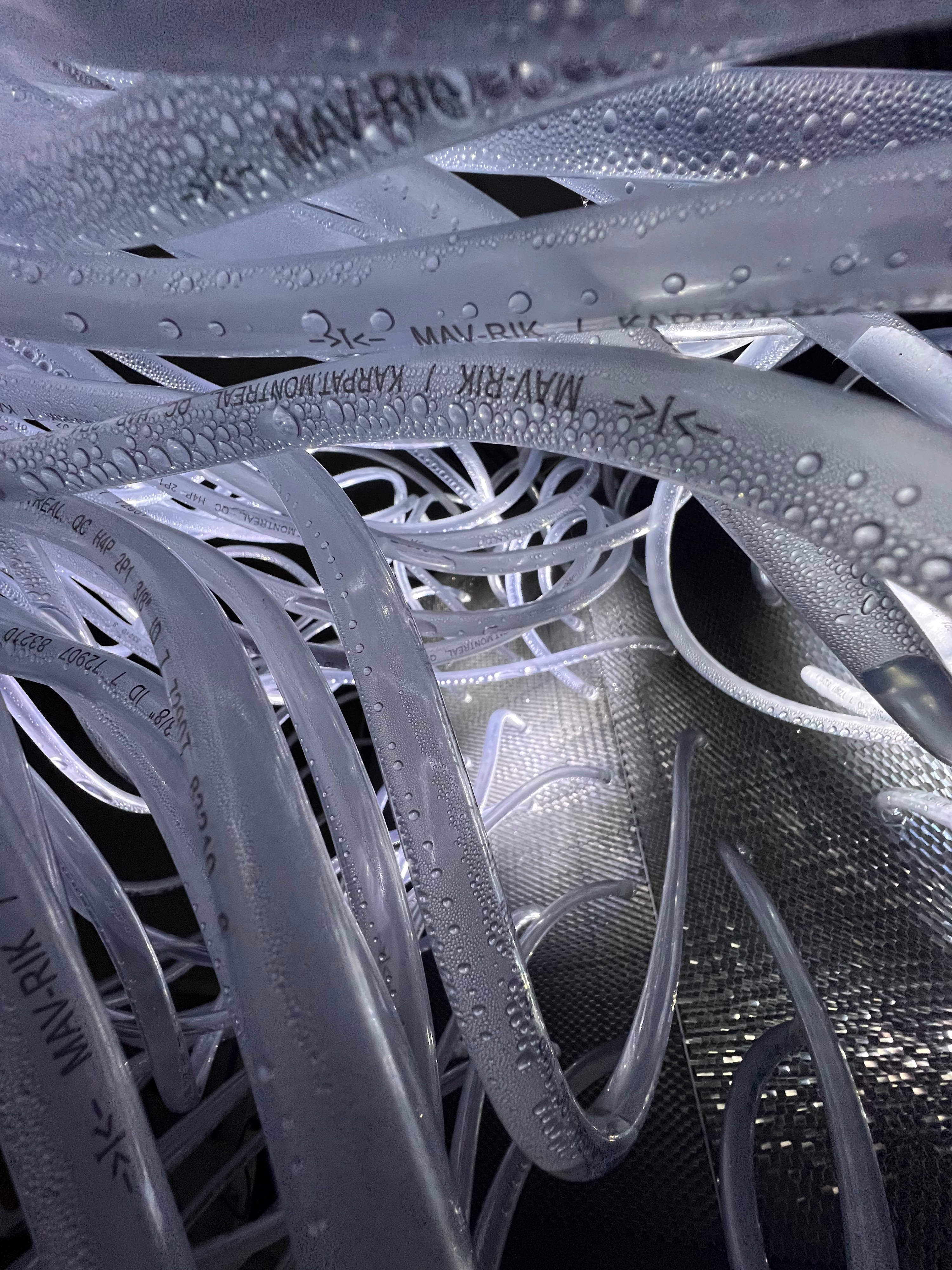 8 • Close-up of the vinyl tubes with mist and condensation droplets.
