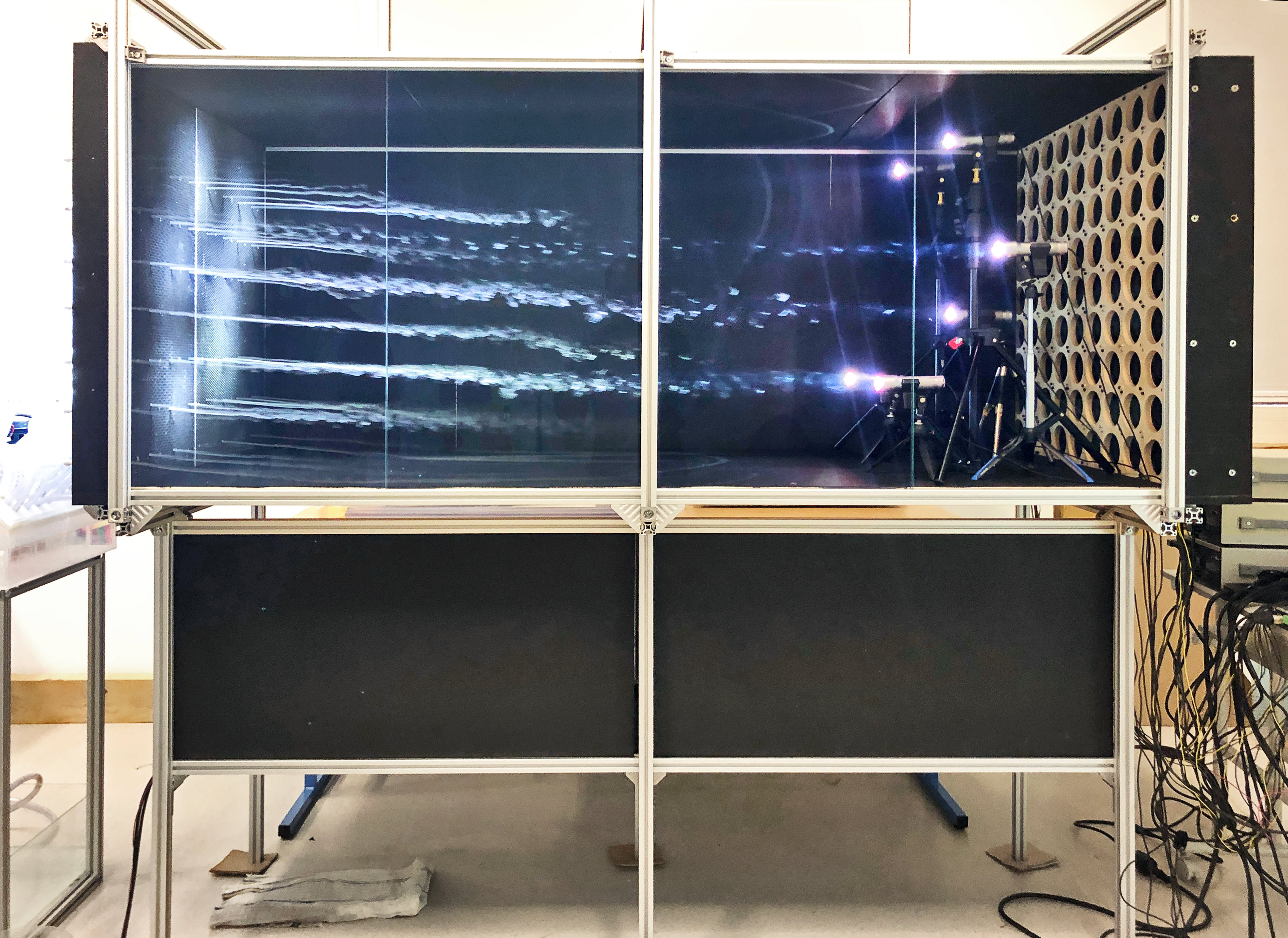 5 • View of the mist generator module. The compressors sit on the top. The mist generators themselves can be seen on the bottom; they are immersed in water. The 64 vinyl tubes are connected to the honeycomb panel intake by a streamlined manifold. The loudspeakers are not installed in this picture (see Fig. 7).